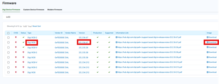 Once in the Digi Remote Manager Firmware section, select the model of the device and the desired version and click on Download: