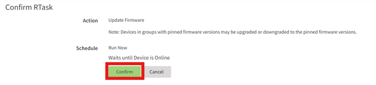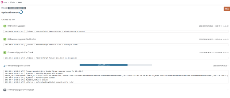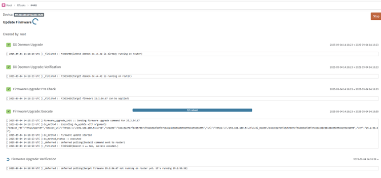 With both options, an Rtask fort he update will start and progress can be monitored until the new firmware verification step is done to confirm the router is now on the new version: