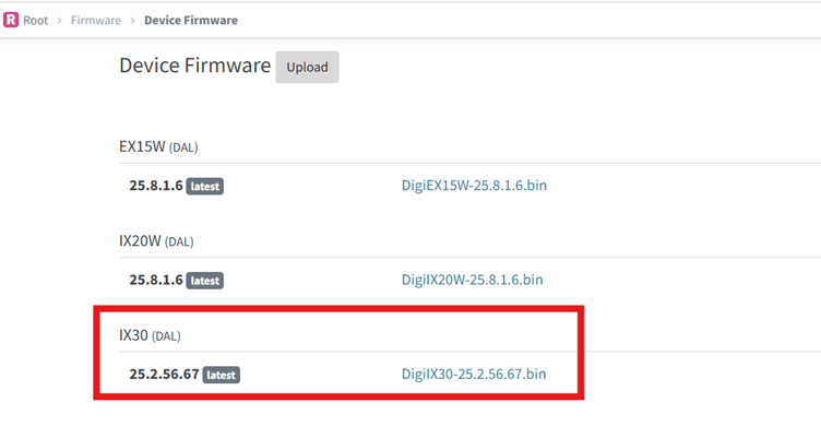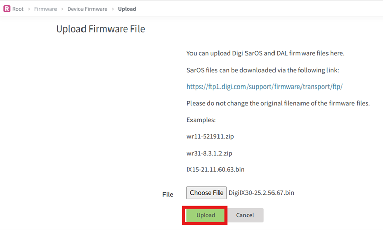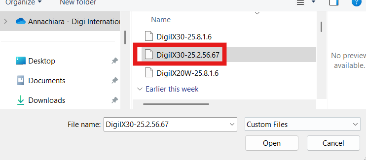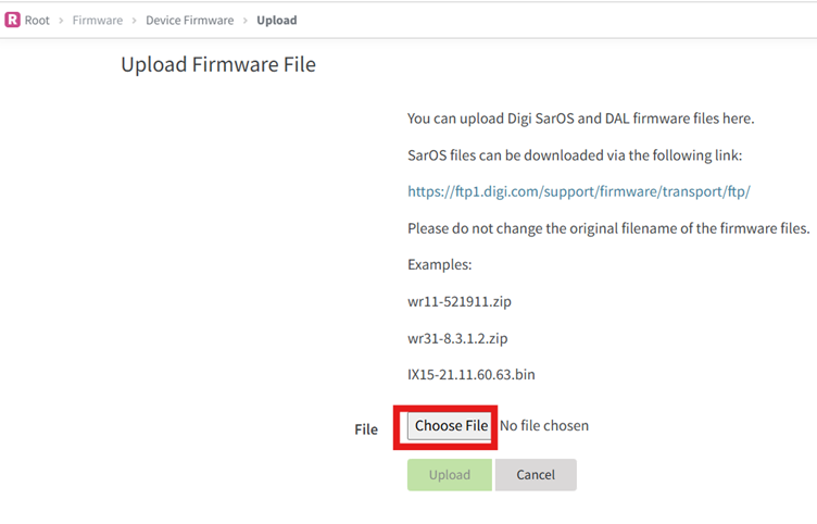 Important: Do not rename the firmware file. The filename format is essential, as it allows Digi OnPremise Manager (DOM) to correctly identify the router model and firmware version.