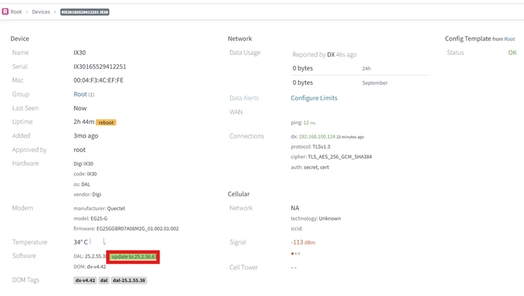 To update the firmware, there are two options, directly click on „Update to“ in the Device dashboard:
