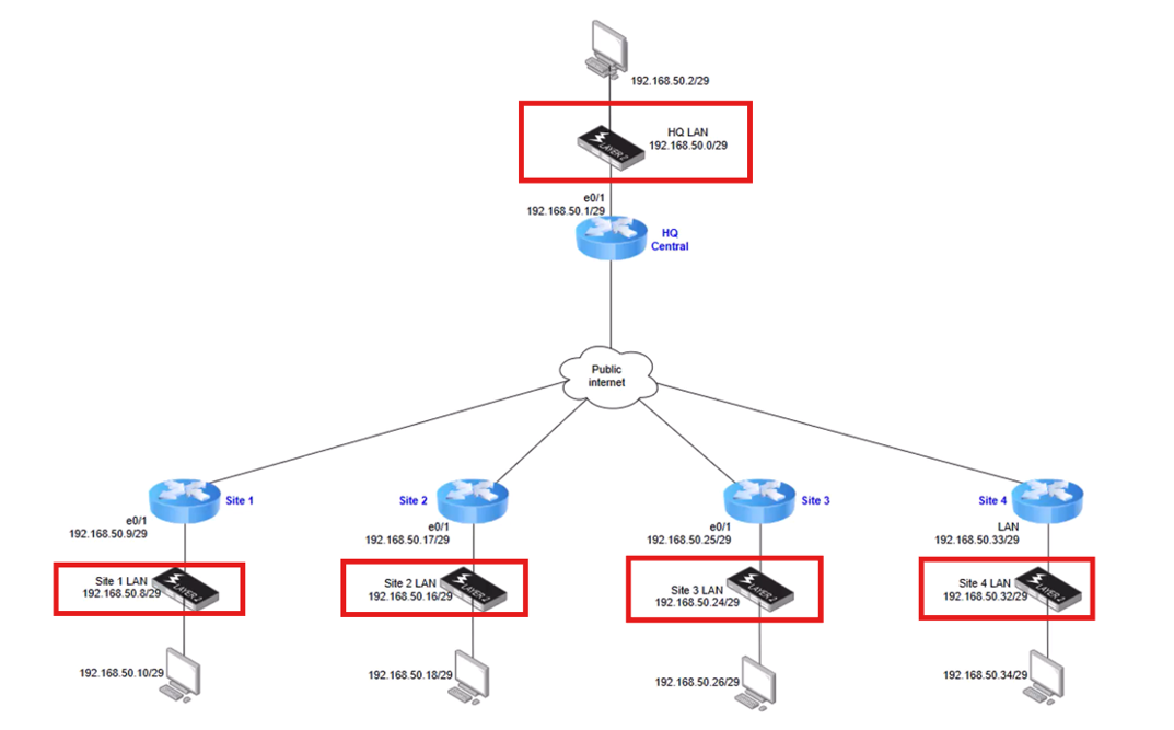Each site’s LAN is assigned a unique /29 subnet. This ensures isolation and simplifies routing within the DMVPN overlay: