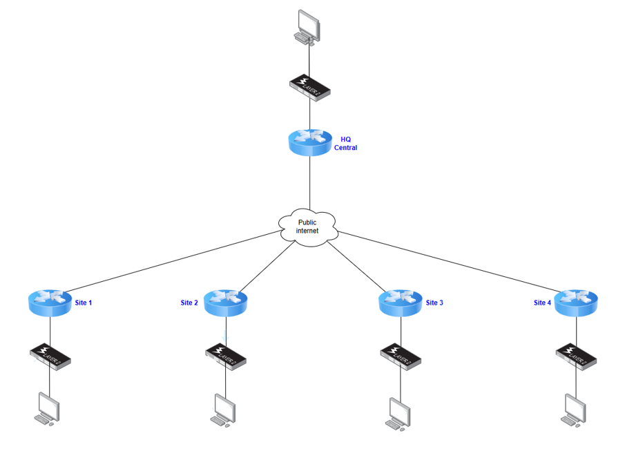 The network used in this DMVPN deplyoment consists of a central hub (HQ) and four spoke sites (remote locations):