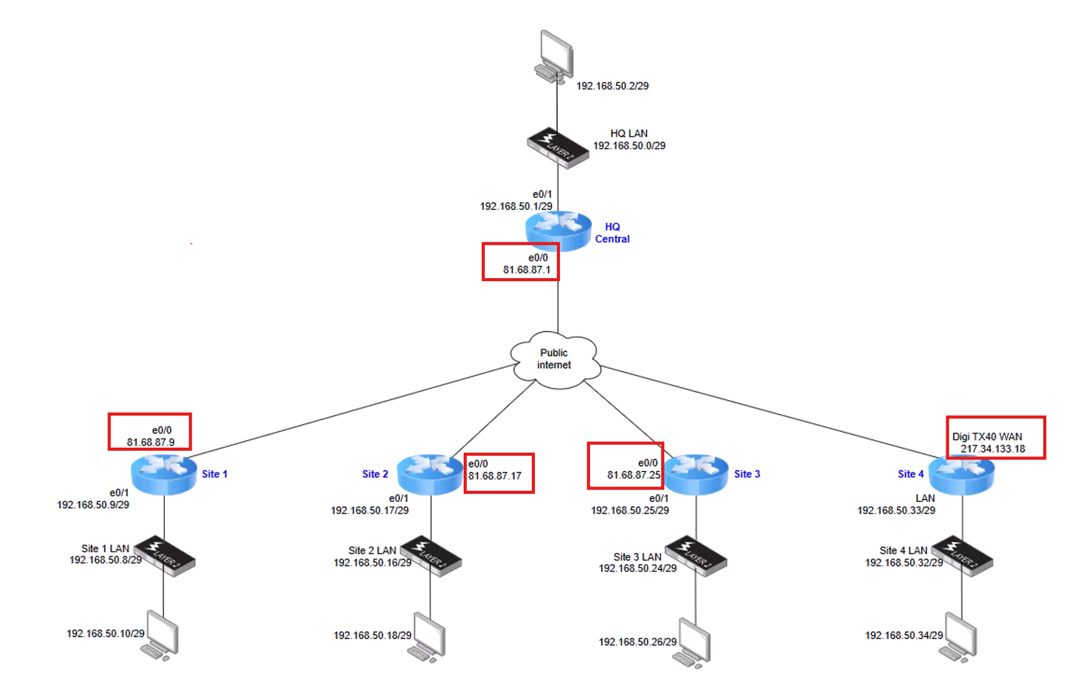 This is Part 1 of a series of Knowledge Base articles detailing the configuration of DMVPN (Dynamic Multipoint VPN) on Digi routers. In this article, we provide an overview of the network topology, along with the physical and logical addressing used in the deployment.