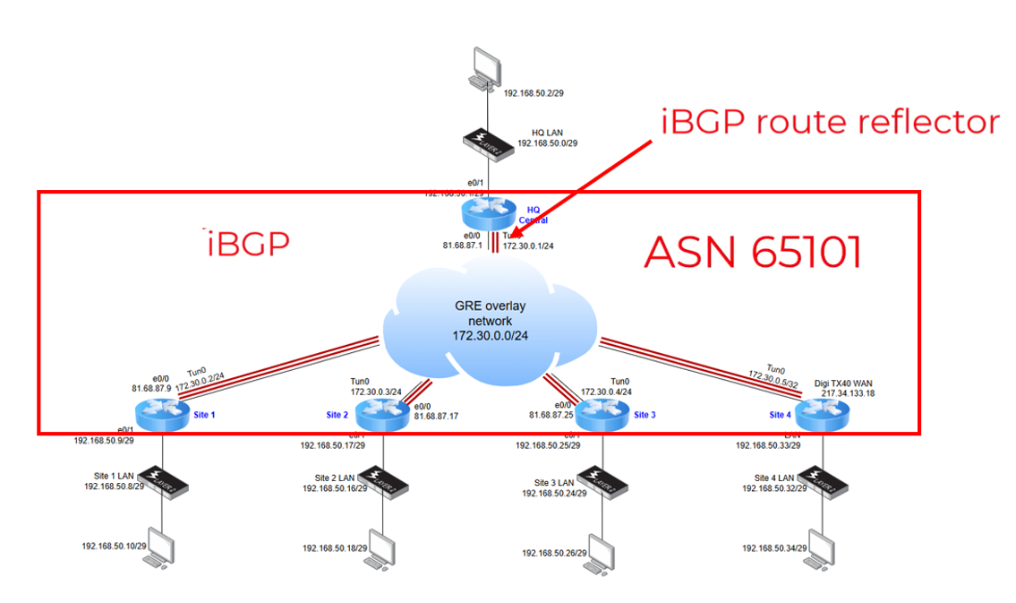- and setting the mGRE address oft he HQ as neighbour with the same ASN