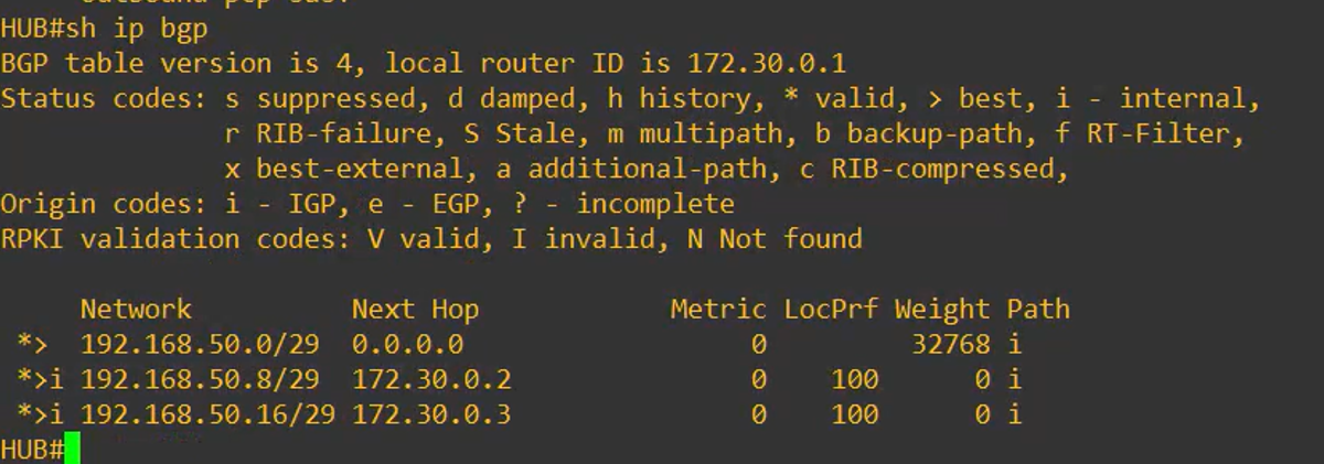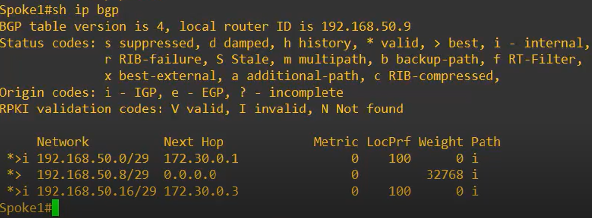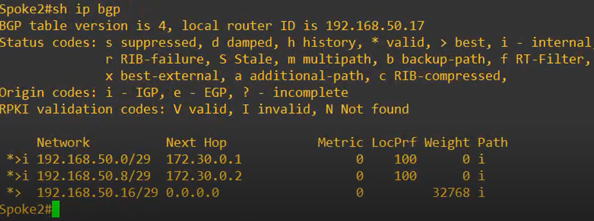 - Note: Each Spoke receives the LAN of the other Spoke via the HUB, which acts as an iBGP Route Reflector, redistributing routes between Spoke 1 and Spoke 2.