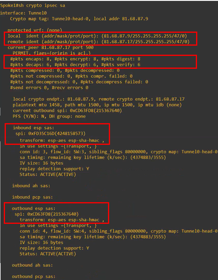 Further down in the output, a second SA is displayed, corresponding to the tunnel established with Spoke 1: