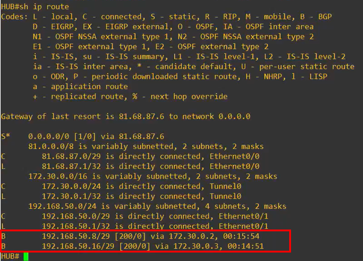 Upon activating the WAN interfaces, the BGP session comes up, for erxample we can see on the HUB: