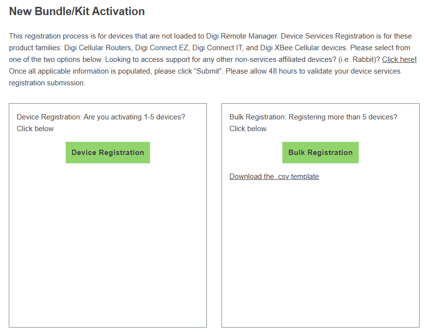 This registration process is for devices that are not being registered in Digi Remote Manager. Device Services Registration is for these product families: Digi Cellular Routers, Digi Connect EZ, Digi Connect IT, and Digi XBee Cellular devices.
