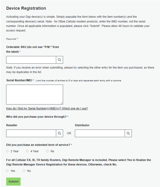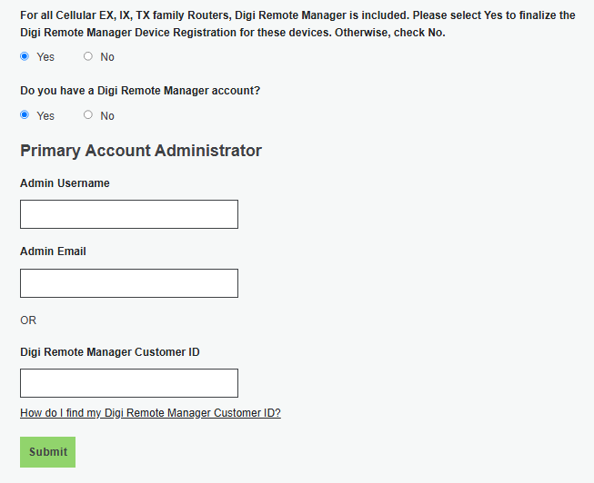 - Enter Yes or No for the question, “For all Cellular EX, IX, TX family routers, Digi Remote Manager….”. If you select yes, the next question will appear. Otherwise, just click "Submit" (step 10).