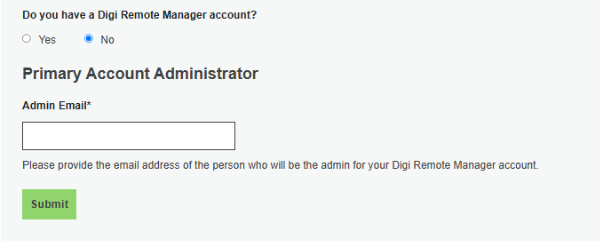 - If no, you will need to enter the admin email address. Please note that the email address provided will be used as the Username and Email address for the Account Administrator for this Digi Remote Manager account (whether or not this is the person actually registering the device).